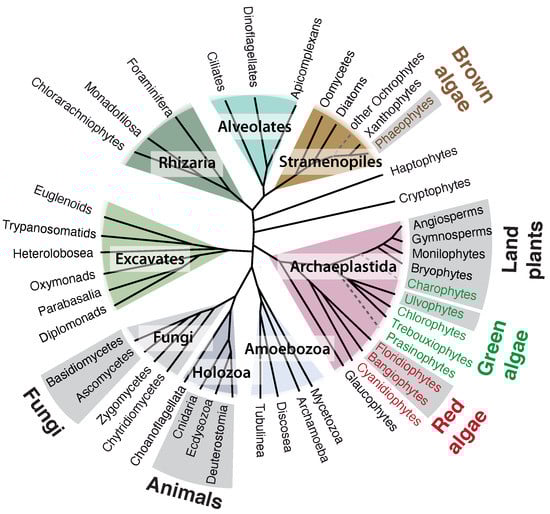 Schematic tree of the eukaryotes showing the phylogenetic positions of the brown, green, and red macroalgal lineages. Gray sectors mark lineages that have given rise to complex multicellular species. Adapted from Coelho and Cock, 2020 [3].