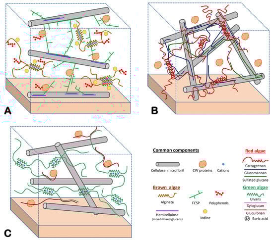 Models of macroalgal extracellular matrices. Semicrystalline cellulose microfibrils are present in almost all types of macroalgae. They constitute a crucial structural component but are sparse in comparison to plant cell walls. Most cell wall structural proteins have yet to be characterized, but their identity is expected to differ in each macroalgal phylum. (A) Brown algae (example of a Fucales species). Alginates are the most abundant component of brown algal ECMs. Alginate chains auto-associate through their guluronate (G)-rich regions. This process is coordinated by Ca2+ ions. Fucose-containing sulfated polysaccharides (FCSPs) acts as cross-linkers between cellulose microfibrils. Hemicelluloses (β-1,4-1,3-glucans, β-1,3-glucans) have been recently identified in brown algae and might act as intermediates between the cellulose microfibrils. Phlorotannins (polyphenols) are likely to be associated with alginates and proteins. Iodine is generally abundant in brown algal ECM but its association mode with other components is unresolved. Arabinogalactan proteins and proteins containing WSC-domains have been identified among CW proteins. Model adapted from Deniaud and coworkers [26] and updated based on the following references [27,28,29]. (B) Red algae (example of a carrageenophyte). Sulfated galactans (carrageenans in this case) are the most abundant polymers of the red algal ECM. Chains containing 3,6-anhydro-D-galactose units associate through hydrogen-bonding and hydrophobic interactions. The resulting helices further cluster into microfibrils by ionic interactions between their sulfate groups and cations. Glucomannans have been shown to cross-link cellulose microfibrils. Sulfated glucans have been identified as a minor component, but their interactions with the other polysaccharides remain uncertain. Model adapted from the following references [32,33,34]. (C) Green algae (Ulva species). The major polysaccharide ulvan can form a weak gel in the presence of both boric acid and divalent cations (e.g., Ca2+). However, the exact mechanism of chain association is currently not understood. Two minor polysaccharides were also identified. Xyloglucans interact with cellulose, but their role as cross-linkers of cellulose microfibrils remains to be demonstrated. In contrast, glucuronans interact with ulvans and proteins. Model adapted from Lahaye and Robic [35].