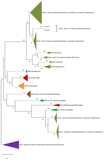 Phylogenetic tree of the cellulose synthases (CESA) and cellulose synthase-like proteins CSL (family GT2). The phylogenetic tree was constructed using the Maximum Likelihood (ML) approach with the program MEGA-X [82]. Numbers indicate the bootstrap values in the ML analysis. Bootstrap values inferior to 50% are not shown. The tree was rooted by the clade of bacterial cellulose synthases. The full listing of the aligned proteins is reported in Supplementary Table S1. The uncompressed tree is shown in Supplementary Figure S1.
