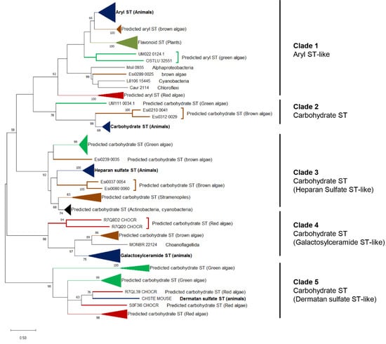 Carbohydrate sulfotransferases (CSTs) are key enzymes for the biosynthesis of sulfated polysaccharides and have been extensively studied in animals [84,85]. Analysis of the E. siliculosus genome revealed the presence of both arylsulfotransferases (ASTs) and carbohydrate sulfotransferases in brown algae. These brown algal CSTs are most likely specific for FCSP and are phylogenetically related to animal CSTs involved in the biosynthesis of GAGs [4], suggesting that the capacity to sulfate polysaccharides is an ancestral eukaryotic trait. In contrast, freshwater and land plants only possess AST, which is responsible for the sulfation of secondary metabolites. It has been proposed that the ancestor of land plants lost CSTs, and thus sulfated polysaccharides, during the transition from marine to freshwater environments as a way to adapt to the limited amount of sulfate in terrestrial environments [4]. The ancestral eukaryotic character of CSTs was further highlighted by the identification of sulfotransferases homologous to animal CSTs in the red macroalgae C. crispus [6] and P. umbilicalis [7], confirming the existence of CSTs in the Archaeplastida phylum. The recent sequencing of the genomes of the marine chlorophyte green alga U. mutabilis and of the freshwater charophyte green alga C. braunii provide essential missing data and therefore a more complete view on the evolution of CSTs in Archaeplastida. While sulfotransferases were not mentioned in the Chara study [9], such enzymes were indicated in a supplementary table of the U. mutabilis article [8], but without distinguishing ASTs and CSTs. We have thus searched for CSTs in these green algal genomes. As previously predicted [4], we did not find any CST homologues in the Chara genome. To clarify the substrate specificity of the Ulva sulfotransferases, we have undertaken a phylogenetic analysis of eukaryotic sulfotransferases (Figure 4).