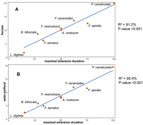 Correlation between the sulfated fucan content of isolated cell walls of brown algae and their position in the intertidal zone. (A). Fucose content (% w/w) vs. duration of emersion (% of time). (B) Sulfate substituent content (% w/w) vs. duration of emersion. The maximal duration of emersion in a daily tidal cycle was calculated for Roscoff (Brittany, France), based on species belt zonation in the intertidal (taken as the medium height relative to the lowest astronomical tide), using the spring tide mid-water mark for Pelvetia canaliculata, Fucus ceranoides, F. spiralis, F. vesiculosus, and Ascophyllum nodosum and the neap tide mid-water mark for F. serratus, Bifurcaria bifurcate, and Laminaria digitata. See Supplementary Table S2 for the corresponding data values.