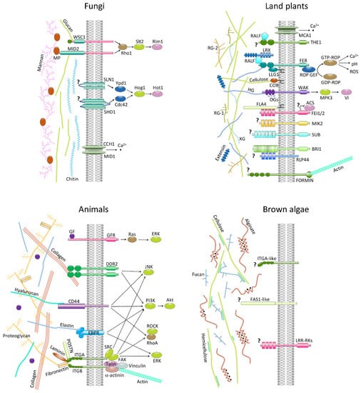 Membrane-localized, ECM-sensing proteins in land plant, animals, and fungi. Related membrane proteins identified in brown algae are also shown. MCA1, MIDI1-complementing activity 1; THE1, THESEUS1; FER, FERONIA; WAK, wall-associated kinase; RALF, rapid alkalinization factor; LRX, leucine-rich repeat extensin; LLG1, LORELEI-like glycosylphosphatidylinositol-anchored protein 1; FLA4, fasciclin-like arabinogalactan protein 4; COB, extracellular glycosyl-phosphatidyl inositol-(GPI)-anchored protein COBRA; FEI1/2, leucine-rich repeat receptor kinases; MIK2, MALE DISCOVERER1-interacting receptor like kinase 2 I; SUB, STRUBBELIG; BRI1, brassinosteroid insensitive 1; RLP44, receptor-like protein 44; ROP, rho of plants; ROP GEF, rho of plants guanine-nucleotide exchange factor; MPK3, map kinase 3; VI, vacuolar invertase; ACS, aminocyclopropane 1-carboxylic acid synthase HG, homogalacturonan; OGs, oligogalacturonides; XG, xyloglucan; RG-1, rhamnogalacturonan I; RG-2, rhamnogalacturonan II; ROS, reactive oxygen species; GF, growth factor; GFR, growth factor receptor; DDR2, Discoidin domain-containing receptor 2; EBPR, Elastin-binding protein receptor, ITGA/B, Integrin A/B subunit; POSTN, fasciclin domain protein periostin; Ras, Ras GTPase; JNK, c-Jun N-terminal mitogen-activated protein kinase; PI3K, Phosphoinositide 3-kinase; Akt, RAC-α serine/threonine-protein kinase; RhoA, Ras homolog A GTPase; ROCK, Rho-associated protein kinase; ERK, Extracellular-signal-regulated mitogen-activated protein kinase; WSC1, Cell wall integrity and stress response component 1; MID2, Mating pheromone-induced death protein 2; SLN1, Synthetic lethal of N-end rule 1; SHO1, Synthetic high osmolarity-sensitive 1; CCH1/MID1, Stretch-activated voltage-gated high-affinity calcium channel composed of Calcium channel homolog 1 and Mating pheromone-induced death protein 1; Rho1, Ras homolog 1 GTPase; Slt2, Suppressor of the lytic phenotype mitogen-activated protein kinase 2; Rlm1, Resistance to lethality of MKK1P386 overexpression MADS-box transcription factor 1; Ypd1, Tyrosine phosphatase dependent 1; Cdc42, Cell division cycle 42 rho-like GTPase; Hog1, High-osmolarity glycerol mitogen-activated protein kinase 1; Hot1, High-osmolarity-induced transcription factor 1; MP, mannoprotein; FAS1-like, Fasciclin-like domain protein, LRR-RKs, Leucine-rich repeat domain receptor kinases; ?, ligand unknown or uncertain step of the signal transduction pathway; black dots, calcium atoms; branched black lines indicate GPI anchors. Adapted from [26,117,118].