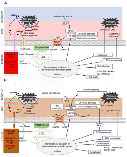 Role of the extracellular matrix in the innate immunity of multicellular red (A) and brown (B) algae. Drawings adapted from in [136] and updated based on evidence provided by the authors of [7,139,140,149,152,161]. Note that the basic principles of innate immunity are shared by brown and red algae (as well as by plants and animals): recognition by Pattern Recognition Receptors (PPRs) of pathogen-derived PAMPs or cell-wall derived DAMPs triggers signaling cascades that activate defense and detoxification responses. Red (A) and brown algae (B) differ by the nature of their DAMPs and PPRs, highlighted in red and brown, respectively. In the ECM per se the main defense responses deal with ECM remodeling (thickening, strengthening) and the secretion of chemicals and enzymes that target the pathogen, eventually leading to the containment of non-adapted pathogens. Abbreviations: PAMPs, pathogen associated molecular patterns; DAMPs, Damage associated molecular patterns; PUFAs, poly unsaturated fatty acids; MAP Kinase, mitogen activated protein kinase; LOX, lipoxygenase; vHPO, vanadium-dependent haloperoxidase; IoH, hypoiodous acid; vBPO, vanadium-dependent bromoperoxidase; BrOH, hypobromous acid; ROS, reactive oxygen species. Org. organic compound. HSPs, heat shock proteins; G6PD, glucose-6-phospate-dehydrogenase; GST, Glutathion-S-transferase; SOD, superoxide dismutase; PKS, polyketate synthase; MC5E, mannuronan C5 epimerase, GHs, glycoside hydrolases.