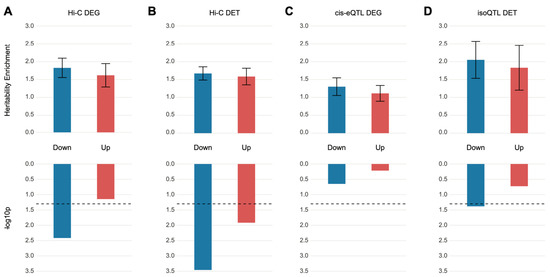 SNPs mapped to differentially expressed genes or transcripts are nominally enriched for heritability of schizophrenia. (A,B) Relationship between differentially expressed genes (DEGs) (A) and differentially expressed transcripts (DETs) (B) in schizophrenia postmortem brains and schizophrenia heritability when genes were mapped to SNPs on the basis of Hi-C evidence. Upregulated genes (enrichment SE = 1.60 0.33, p = , FDR = 0.11) were not enriched for schizophrenia heritability, but the downregulated genes (enrichment SE = 1.80 0.27, p = , FDR = 0.015) barely surpassed the FDR threshold (FDR < 0.05) and showed heritability enrichment of schizophrenia. Both downregulated (enrichment SE = 1.67 0.19, p = , FDR = 0.0028) and upregulated (enrichment SE = 1.58 0.23, p = , FDR = 0.032) transcripts showed significant enrichment for the heritability of schizophrenia. (C,D) Relationship between DEGs (C) and DETs (D) in schizophrenic postmortem brains and schizophrenia heritability when genes were mapped to SNPs on the basis of eQTL and isoQTL, respectively. Only downregulated DETs were nominally enriched for schizophrenia heritability (downregulated DETs, enrichment SE = 2.05 0.52, p = , FDR = 0.083; upregulated DETs, enrichment SE = 1.83 0.63, p = , FDR = 0.25).