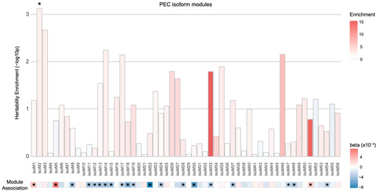 Heritability enrichment of the isoform-level co-expression modules associated with schizophrenia. One PEC isoform-level co-expression module (isoM2) was significantly enriched for schizophrenia heritability (* FDR < 0.05) when isoforms in the module were mapped to SNPs on the basis of Hi-C evidence. However, isoM2 was not significantly dysregulated in schizophrenia. An asterisk (*) in the module association heatmap indicates the isoform co-expression modules that are significantly associated with schizophrenia with eigengenes upregulated (red, ) or downregulated (blue, ) in schizophrenic postmortem brains.