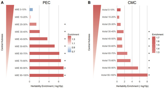 Genes with low network connectivity were enriched for schizophrenia heritability. (A) Genes in the kME 90–100% group (enrichment SE = 1.50 0.09, p = , FDR = ) and kME 80–90% group (enrichment SE = 1.50 0.09, p = , FDR = ) were most enriched for heritability of schizophrenia. (B) Genes in the kTotal 90–100% group (enrichment SE = 1.57 0.1, p = , FDR = ) were most enriched for heritability of schizophrenia, indicating that peripheral genes are more associated with heritability. The genes in each kME/kTotal group were mapped to SNPs on the basis of Hi-C evidence and the heritability explained by the SNPs in each group was calculated. As kME/kTotal increases, the central hubness of genes within a given module increases. * FDR < 0.05.