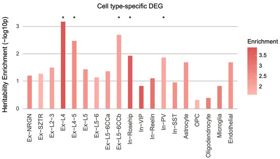 In addition to transcriptomic features obtained from bulk-brain RNA-seq, cell type-specific DEGs were obtained from Ruzicka et al. [14]. For a given cell type, we combined up- and downregulated genes to define DEGs, because there was a much smaller number of down- and upregulated genes identified by cell type-specific RNA-seq than were identified by bulk-brain RNA-seq. Therefore, to increase the statistical power of heritability enrichment analysis, we merged the down- and upregulated genes identified from each cell type to define cell type-specific DEGs.