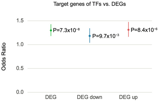 Schizophrenia DEGs were overrepresented with the target genes of schizophrenia-associated TFs. Forest plot of odds ratio estimates with 95% confidence intervals from overrepresentation analysis between schizophrenia DEGs and the target genes of schizophrenia-associated TFs. DEG represents a combined list of up- and downregulated genes.