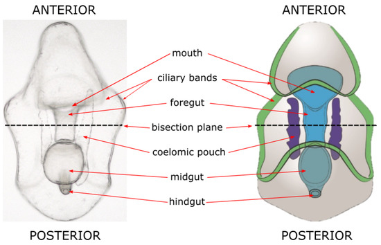 - Vickery, M.S.; Vickery, M.C.L.; McClintock, J.B. Morphogenesis and Organogenesis in the Regenerating Planktotrophic Larvae of Asteroids and Echinoids. Biol. Bull. 2002, 203, 121–133. [Google Scholar] [CrossRef] [PubMed]