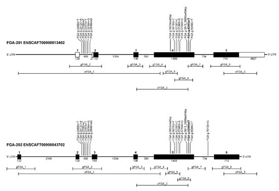 Sanger sequencing of canine complementary DNA (cDNA) of a control dog confirmed the gene model with two transcripts in FGB (ENSCAFT00000035915/ENSCAFT00000013386), two transcripts in FGG (ENSCAFT00000013420/XM_532698.5), and three transcripts in FGA (ENSCAFT00000043702/ENSCAFT00000013402/unknown), of which one transcript was not in the Ensembl or NCBI database (Figure 2; Supplementary Figures S1 and S2).