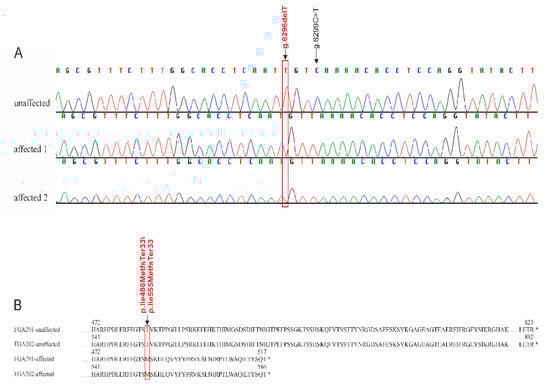 Frameshift mutation in afibrinogenemia-affected Dachshunds. Nucleotide key for the respective individual is given above the chromatogram. Chromatograms from sequencing analysis show the frameshift variant FGA:g.6296delT (rs1152388481) in both affected dogs (affected 1–2, identical to case 1–2; (A)). Comparisons of the predicted protein sequence of FGA transcripts (FGA201 and FGA202) in affected and unaffected dogs display a significant shortening of the amino acid sequence due to the frameshift mutation (B).