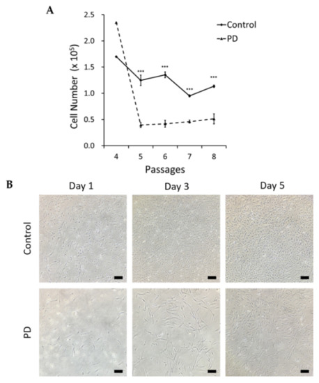 MSCs derived from a healthy individual and a patient with PD were cultured through passages 4 to 8 in 6-well plates, and the number of cells counted after each passage, to compare the proliferation rates between control and PD cells. Figure 1A shows that the number of PD cells decreased rapidly at passage 5, while the number of MSCs reduced more gradually in healthy control cells (Figure 1A). The numbers of PD cells were significantly decreased compared to the control cells from passages 5 through 8 (p < 0.001). Furthermore, differences between the proliferation of control and PD cells were clearly visible in serial cell images (Figure 1B and Figure S1).