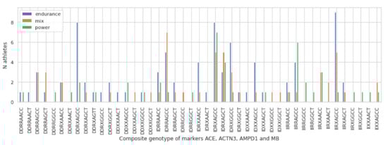 Representation of a number of athletes in endurance, mixed, and power sports carrying a specific genotype combination.