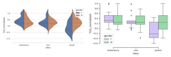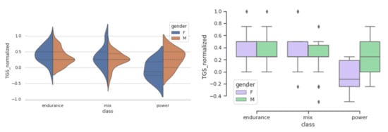 TGS is an integrative metric, representing the additive effect of all genotypes in predicting a trait. We analysed how LR TGS and WF TGS values are distributed in endurance, mix, and power groups. Figure 2 and Figure 3 represent distribution of LR TGS and WF TGS for genders in different sport groups and show how these TGS distributions differ between endurance, mix, and power sports, and also between males and females.