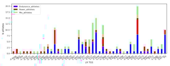 Figure 4 and Figure 5 clearly show the difference between the LR TGS and WF TGS. The former is more granular and represents a variability in genotype combinations better. Although the latter gets concentrated in a small number of levels. In both cases, the athletes from the power group are represented by the range of the negative TGS values (normalised in both cases). However, we observe that there is a significant overlap between the three sport classes in genotype combinations and their corresponding TGS values. A majority of the TGS values are not pure power or endurance or mix.