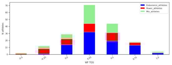Athletes data order by the WG TGS values. The graph shows a number of athletes from the different sports characterised by the same WF TGS value. Values are ordered from negative representing the power class towards positive, representing the endurance class.