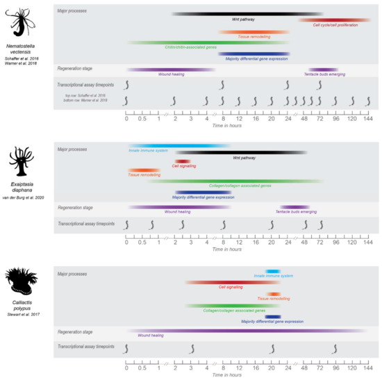 In other sea anemones, one study in C. polypus has examined the transcriptomic response over time (0, 3, 20, and 96 hpa) to longitudinal dissection of individuals that were quartered [78] and one study in E. diaphana has examined the transcriptomic response of head regeneration (from the aboral portion) over time (0, 45 min, 2.5, 8, 20, 48 and 72 hpa) following transverse dissection [91]. An overview of the timing of major gene expression processes that occur during regeneration in these three sea anemones is demonstrated by Figure 1. Virtually no molecular studies of regeneration have been performed in sea anemones outside of these three organisms. Further, each study has used different experimental strategies to assay regeneration, and hence, not all aspects of regeneration can be comprehensively and equivocally compared.
