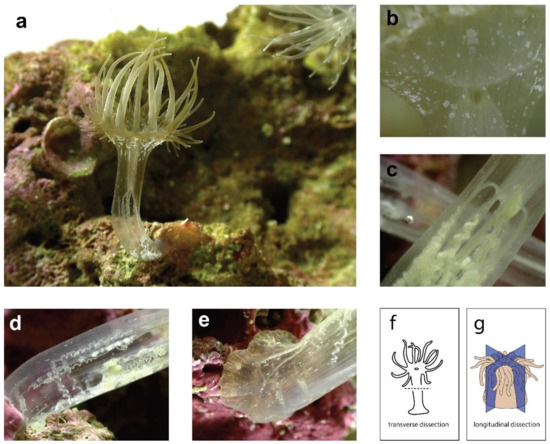 Multiple images of a bleached E. diaphana individual, showing the internal tissue organization. (a) an E. diaphana individual attached to a coral rock, in an upright position; (b) a portion of the oral disc showing where the mouth meets the pharynx; (c) the middle of the body column where the mesentery filaments are attached to the end of the pharynx (enterostome); (d) lower half of the body column, showing mesenteries and acontia; (e) lowest portion of body column and pedal disc (f) diagram of sea anemone showing transverse dissection plane; (g) diagram of sea anemone showing longitudinal dissection planes, reproduced with permission from [78]. See Supplementary File S1 for image copyrights and attributions.