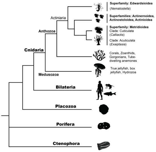 Metazoan phylogeny shows the phylogenetic placement of Cnidarians, including the two major classes within Cnidaria: Medusozoa (e.g., jellyfish, hydrozoans) and Anthozoa (e.g., corals, sea anemones). All non-actiniarian Anthozoans are shown as a single branch for visual simplicity. Internal branches within the order Actiniaria show where Nematostella, Exaiptasia and Calliactis species sit within the superfamilies Edwardsioidea and Metridioidea. Actiniarian branches have been simplified here for visual purposes; however, Actiniaria is not monophyletic and there is conflict over current hierarchies, see [21]. See Supplementary File S1, Table S1 for image copyrights and attributions.