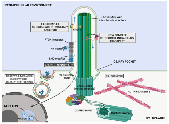 The primary cilium transduces extracellular signals as it houses an intense signalling, mediated by different pathways, of which Hedgehog (HH) and Wingless-related integration site (Wnt), play pivotal roles [9,37].