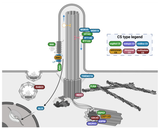 Overview of the primary cilium-related gene products involved in CS pathophysiology. Genes are clustered according to their function and location in the ciliary structures. Gene products labels are coloured after the suture sites (CS type legend) that are prevalently involved in the associated phenotypes (see Section 3.1 and Section 3.2 for details). The functional ciliary gene clusters and the associated phenotypes indicate some level of genotype/phenotype correlations: (i). the genes encoding adaptor proteins needed for the intraflagellar complex A-mediated retrograde transport (IFT122, IFT43, IFT140, WDR35, WDR19) are found mutated in phenotypes with midline CS, prevalently affecting the sagittal suture; (ii). genes encoding main players of the hedgehog pathway (SMO, GLI3, IHH, EVC and RAB23) are associated with more heterogeneous suture involvement, ranging from single sagittal or unicoronal CS, to bicoronal and multi-suture craniosynostoses; (iii). the genes products involved in the regulation of centrosome cycle, ciliary trafficking and cilium assembly are mutated in syndromes that may feature either midline CS (ASPM, MCPH1, CEP57, TMEM216, FLNA), or uni/bicoronal CS (NEK1, CEP120) up to multisuture CS (CDC45).