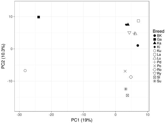 Principal component analysis based on alleles frequency for all studied breeds (White Kołuda® (BK), Kielecka (Ki), Podkarpacka (Pd), Garbonosa (Ga), Pomorska (Po), Rypinska (Ry), Landes (La), Lubelska (Lu), Suwalska (Su), Kartuska (Ka), Romanska (Ro), Slowacka (Sl) and Kubanska (Ku)).