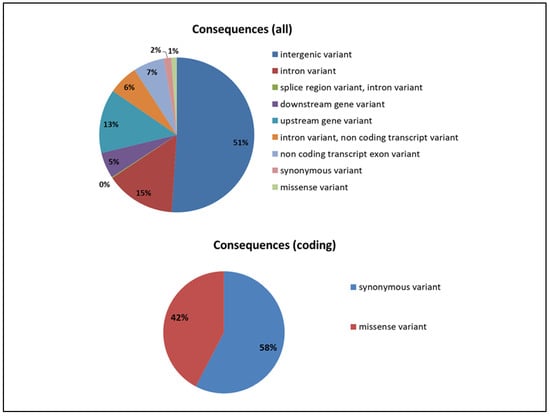 Annotation analysis of SNPs, with respect to the genes from the GooseV1.0 assembly, showed that most of the identified variants were found in the intergenic regions (51%). A relatively high number of variants were also found in the gene introns (14.6%), as well as in the upstream gene regions, including promotes (13.3%). Among SNPs located in coding sequences, 58% were synonymous (Figure 3).