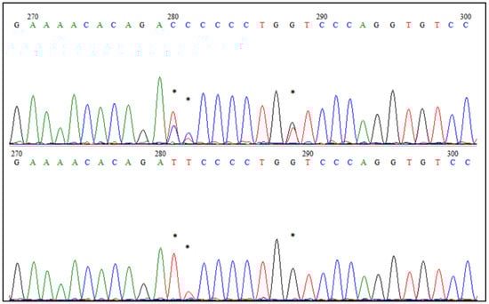 Chromatograms of fragments of the EDAR gene sequence after the Sanger sequencing. Asterisks indicate polymorphic SNPs, also identified by the GBS method.