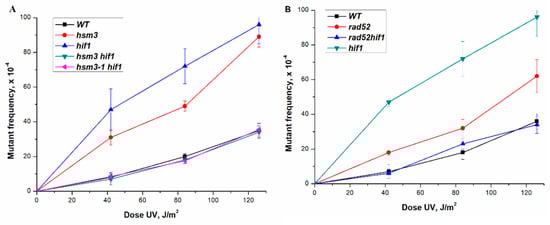 However, the rad52Δ mutation suppresses hsm3- and hif1-dependent UV-induced mutagenesis in different ways. In the hif1Δ mutant, the rad52Δ mutation suppresses the frequency of UV-induced mutations to the wild-type level, while in the hsm3Δ mutant the rad52Δ mutation slightly reduces the frequency of UV-induced mutations [38]. There was also a difference in the frequency of UV-induced mutagenesis in single mutants hsm3Δ and hif1Δ (Figure 2A).