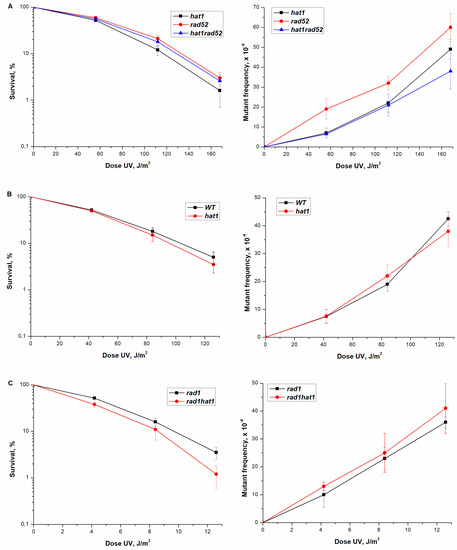 Sensitivity and mutagenesis in different strains after UV irradiation at different doses. The viable titer was determined, and the percentage of survivals was calculated. The mean ± SEM values obtained from 4 independent experiments are plotted. (A) UV-sensitivity and mutation frequency in mutant strains hat1Δ (CAY-2), rad52Δ (10-CAY-3031), hat1Δ rad52Δ (CAY-4); (B) UV-sensitivity and mutation frequency in strain wild-type (LMG-3031) and mutant strain hat1Δ (CAY-2); (C) UV-sensitivity and mutation frequency in mutant strains rad1Δ (LMG-351), rad1Δ hat1Δ (CAY-6).