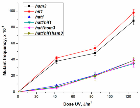 Figure 4 shows the dependence of the mutagenesis frequency on the dose of UV rays for single hat1Δ, hsm3Δ and hif1Δ mutants, double hat1Δ hif1Δ, hat1Δ hsm3Δ, hsm3Δ hif1Δ mutants and triple hat1Δ hsm3Δ hif1Δ mutant. As can be seen from this figure, hat1Δ mutation epistatizes to all studied mutations.