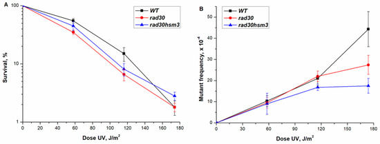 Sensitivity and mutagenesis in different strains after UV irradiation at different doses. The viable titer was determined, and the percentage of survivals was calculated. The mean ± SEM values obtained from four independent experiments are plotted. (A) UV-induced sensitivity in strain wild-type (LMG-3031) and mutant strains rad30Δ (TAE-153), rad30Δ hsm3Δ (TAE-152); (B) Frequencies of UV-induced mutations in wild-type (LMG-3031) and mutant strains rad30Δ (TAE-153), rad30Δ hsm3Δ (TAE-152).