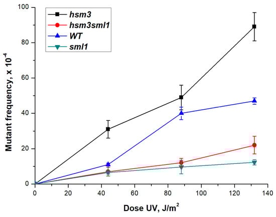 UV-induced mutagenesis in strain wild-type (LMG-3031) and mutant strains hsm3Δ (5-LGM-3031), hsm3Δ sml1Δ (TAE-151), sml1Δ (6- DVF-3031) at different UV doses. The mutation frequencies were determined, as a ratio of the number of white colonies to the number of all colonies grown in a cup with complete medium. The mean ± SEM values obtained from 4 independent experiments are plotted.