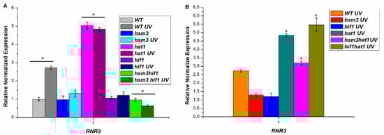 Relative normalized expression of the RNR3 gene, before and after irradiation with UV light of the corresponding strains (after UV irradiation, the cells were kept for two hours at 30 °C in a thermostat for induction), UV dose at 252 J/m2; * p < 0.05, Student’s t test. (A) Relative normalized expression of the RNR3 gene, before and after irradiation with UV light; (B) Relative normalized expression of the RNR3 gene, after irradiation with UV light.