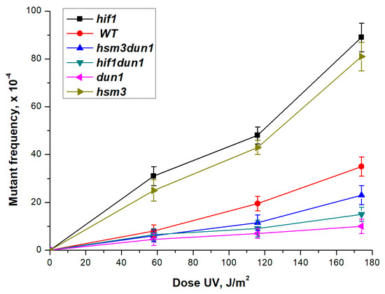 UV-induced mutagenesis in mutant strains hif1Δ (CAY-3), hsm3Δ dun1Δ (DVF-15), hif1Δ dun1Δ (TAE-154), dun1Δ (DVF-16), hsm3Δ (5-LGM-3031), and strain wild-type (LMG-3031) at different UV doses. The mutation frequencies were determined, as a ratio of the number of white colonies to the number of all colonies grown in a cup with complete medium. The mean ± SEM values obtained from four independent experiments are plotted.