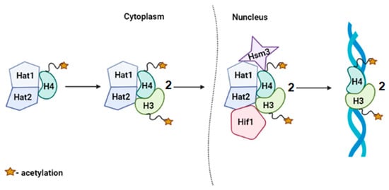 A model describing the potential mechanism of action of the Hsm3p as part of NuB4 complex. This model describes an approximate mechanism of action of Hsm3p, as a subunit of the histone acetyltransferases complex NuB4. Most likely, Hsm3p joins in the Hat1p/Hat2p complex, as well as Hif1p.