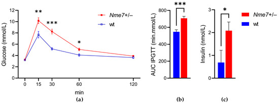 The intraperitoneal glucose tolerance test (IPGTT): (a) The course of glycaemic curves in wild-type (wt, open blue squares, n = 10) and Nme7+/− heterozygous (Nme7+/−, red closed squares, n = 17) male) rats. (b) Areas under the glycaemic curves (AUC) and (c) fasting insulin in wild-type (wt, blue bars) and Nme7+/− heterozygous (Nme7+/−, red bars) rats. Data are expressed as mean ± SEM; the significance levels for strain comparison using the repeated measures ANOVA (IPGTT) or the unpaired (two-tailed) Student t-test (AUC, insulin) are indicated as follows: * p < 0.05, ** p < 0.01, *** p < 0.001.