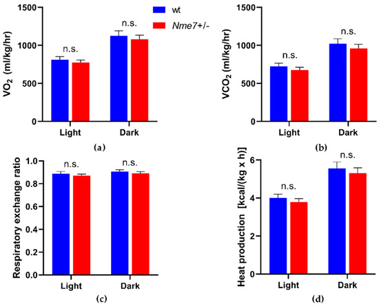 (a) Quantification of O2 consumption; (b) Quantification of carbon dioxide release; (c) Respiratory exchange ratio; (d) Heat production in wild-type (wt, blue, n = 6) and Nme7+/− heterozygous (Nme7+/−, red, n = 7) male rats, corrected for bodyweight. Data are expressed as mean ± SEM; the strain comparison using the post-hoc Fisher’s least significant difference test of the two-way ANOVA for STRAIN and PERIOD as major factors are indicated in the graph as follows: n.s. not significant.