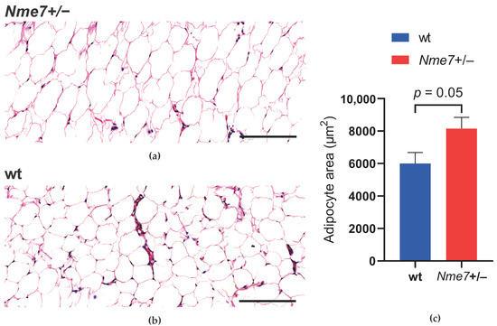 Adipose tissue of epididymal fat pad in Nme7+/− heterozygous (a) and wild-type (b) rats, hematoxylin-eosin staining, bars indicate 200 μm; (c) Adipocyte area (epididymal fat pad) of wild-type (wt, blue, n = 5) and Nme7+/− heterozygous (Nme7+/−, red, n = 6) male rats. Data are expressed as mean ± SEM; the significance level for strain comparison using the unpaired (two-tailed) Student t-test is indicated in the graph.