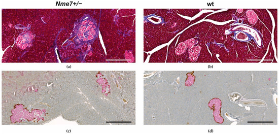 Representative islet changes in Nme7 +/– male rats: Irregular-border islets with fibrotic collagenous tissue segregating the functional areas of β-cells (a) compared to non-fibrotic islets of wt male controls. Masson trichrome stains the collagen fibers in blue (a,b). Insulin (pink) and glucagon (brown) staining of pancreas show enlarged and disrupted islets in Nme7+/− male rats (c) compared to compact islets in wt male rats (d). Bars indicate 500 μm.
