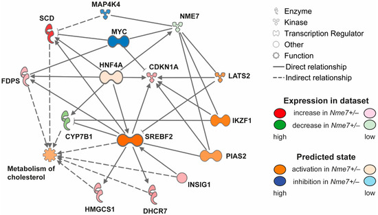 We assessed the expression of Nme7 in the liver, kidney, white adipose (epididymal) tissue, and pancreas of Nme7+/− male rats. In all tested tissues, Nme7+/− animals showed lower expression of Nme7. The comparison of white adipose tissue transcriptomes between Nme7+/− and wild-type rats did not reveal, after correction for multiple testing, any other significantly differentially expressed genes. In the liver of Nme7+/− males, we observed 38 downregulated and 41 upregulated transcripts compared to wt (Supplementary Table S2). Apart from Nme7, hydroxysteroid (17-β) dehydrogenase 2 (Hsd17b2), cytochrome P450 7B1 (Cyp7b1, also known as oxysterol 7α-hydroxylase), and sulfotransferase 2A1 (Sult2A1) showed lower hepatic expression in Nme7+/– animals. Conversely, stearoyl-CoA desaturase 1 (Scd1), fatty acid desaturase 1 (Fads1), 7-dehydrocholesterol reductase (Dhcr7) or insulin-induced gene 1 (Insig1) were among the upregulated in Nme7+/– when compared to wild-type rats. The most pronounced differences in expression were corroborated by qPCR validation (Supplementary Figure S4). The most enriched disease and function classes were steroid metabolism and cholesterol metabolism (Benjamini–Hochberg corrected p = 4.28 × 10−5 and 1.85 × 10−4, respectively). In the analysis of potential upstream regulators (Supplementary Table S3), sterol regulatory element binding transcription factors 1 and 2 (Srebf1, Srebf2) stood out as the predicted major activated regulators (activation z-scores 3.09 and 2.23; p = 2.91 × 10−11 and p = 1.51 × 10−10, respectively) and cytochrome P450 oxidoreductase (Por) was predicted to be the most inhibited one (activation z-score −2.24; p = 5.22 × 10−9). Most of the above nodes and transcripts were recapitulated in the derived mechanistic network, reaching the highest consistency score (Figure 7).