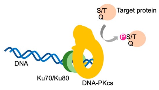 Cells regulate the cell cycle and gene expression rapidly in response to both intracellular and extracellular stresses, during which signal transduction is primarily regulated via phosphorylation [,,]. Within these signal transduction pathways, members of the PI3K-related kinase (PIKK) family, including ataxia-telangiectasia mutated (ATM), ataxia telangiectasia and Rad3-related (ATR), the DNA-dependent protein kinase catalytic subunit (DNA-PKcs), the mammalian target of rapamycin (mTOR), the suppressor with morphological effect on genitalia-1 (SMG-1) and the TRAF and TNF receptor-associated protein (TTRAP), are known to play central roles []. Although TTRAP lacks serine/threonine kinase activity, all of these proteins are characterized by the presence of HEAT, FAT and kinase domains [,,]. Phylogenetic analyses of DNA-PKcs have recently indicated that many metazoans and plants have putative gene encoding DNA-PKcs. However, many model organisms such as Saccharomyces cerevisiae, Schizosaccharomyces pombe, Caenorhabditis elegans, Drosophila melanogaster and Arabidopsis thaliana lack an ortholog of DNA-PKcs. Therefore, DNA-PKcs appears to have been lost or its functions may have been diversified as organisms adapted to their environment during the course of evolution []. DNA-PKcs has been established as playing a central role in non-homologous end-joining (NHEJ), a DNA double-strand break (DSB) repair pathway, and its activation is dependent on its interactions with the Ku complex [,,]. DNA-PKcs binds rapidly to DNA in the presence of Ku and it has been reported that the interaction of Akt1 and/or EGFR with DNA-PKcs promotes the activation of DNA-PK []. During NHEJ, the Ku70/Ku80 complex rapidly binds to DNA ends in response to DSBs; DNA-PKcs then binds to these DNA ends followed by the recruitment of NHEJ factors such as Artemis and DNA polymerase λ/μ, which subsequently process the DNA ends to generate ligatable ends [,]. In organisms that lack the gene encoding for DNA-PKcs, such as fission yeast (Schizosaccharomyces pombe), the Mre11/Rad50/Xrs2 complex interacts with NHEJ factors such as DNA ligase IV, is involved in the end-resection step of NHEJ and ensures NHEJ fidelity [,,]. It has also been suggested that PAXX interacts with the Ku complex and stabilizes DNA ends [,,] and that XRCC4/XLF filaments are formed within the vicinity of DNA ends to protect the DNA ends from further degradation [,,,,]. However, the order and timing of DNA-PKcs binding and recruitment of these NHEJ factors have yet to be sufficiently established.