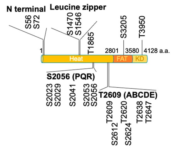 DNA-PKcs primarily recognizes serine/glutamine and threonine/glutamine motifs in substrate proteins and phosphorylate serine and threonine residues in the presence of the Ku complex and double-stranded DNA (Figure 1) []. As shown in Figure 2, DNA-PKcs consists of the HEAT, FAT and kinase domains. The HEAT domain contains two major autophosphorylation clusters referred to as the S2056 (S2023–S2056) and T2609 (T2609–T2647) clusters, also known as the PQR and ABCDE clusters, respectively [,,].