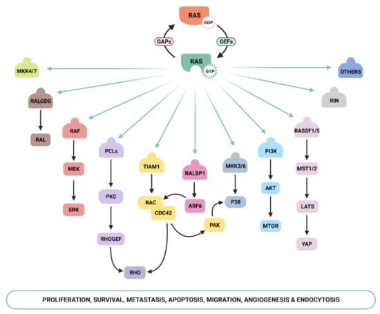 Ras effector pathways. GTP binding to Ras induces changes in protein conformation that increases Ras affinity for downstream effectors, thus activating many different signal transduction pathways. Among them, Raf/MEK/ERK, PI3K/AKT, and Ral are the best understood. Further, Ras crosslinks with other signaling pathways such as proteins from the Rho family and YAP. Through the regulation of the different downstream pathways, Ras proteins play a key role in the control of proliferation, survival, metastasis, apoptosis, migration, angiogenesis, and endocytosis.