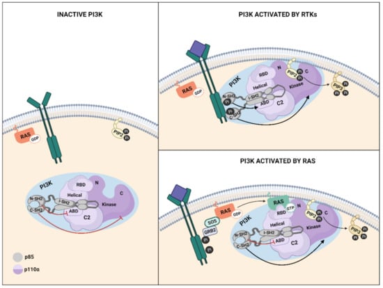 The multidomain architecture in PI3K regulatory and catalytic subunits contributes to the mechanisms through which PI3Kα activity is controlled as interactions between both subunits stabilize the overall structure and keep PI3K in the inactive state [93,94] (Figure 3). The N-terminal-SH2 (nSH2) and the Inter-SH2(iSH2) domains of p85 are required for full inhibition of p110α lipid kinase activity [95,96]. When the ligand binds to RTK, the phosphorylated tyrosine (pY) motifs in the receptors bind to the nSH2 domain of p85, thus disrupting the inhibitory contact between the nSH2 and the catalytic subunit and inducing a conformational change in p110α that leads to its activation [95]. Specifically, after nSH2 release, the C-lobe of the kinase domain moves away from the C2 domain, exposing the p110α membrane binding surface to membrane interactions. The activation loop in the kinase domain becomes more flexible and approaches ATP, generating an active PI3Kα conformation for substrate catalysis [36] (Figure 3). For Ras-mediated PI3K activation, the inhibition exerted by p85 is relieved through dissociation of p110 and p85, with the nSH2 domain of p85 playing a key role [96,97] (Figure 3). Recently, computational analysis of K-Ras4B-mediated activation of p110α has shown that K-Ras4B/RBD binding disrupted the interactions along the p110/p85 interface through the induction of overall structural displacement of both nSH2 and iSH2 in p85 from the neighboring functional domains in p110 including the C2, helical, and kinase domains. This results in the exposure of the kinase domain and facilitates the full activation of PI3Kα [98].