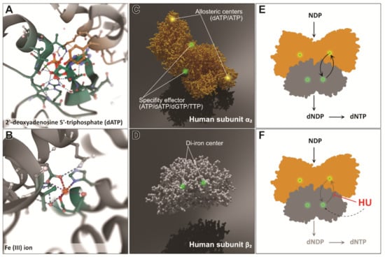 The structures of two homodimeric subunits of ribonucleotide reductase and the impact of hydroxyurea on the PCET transfer: (A) the dATP in the allosteric center of subunit α2 of human RNR (PDB: 2WGH) []; (B) the Fe(3+) ion center of the human β2 subunit (PDB: 2UW2); (C) a 3D model of the α2 subunit with the allosteric sites and active (substrate) sites (PDB: 2WGH); (D) a 3D model of the β2 subunit with the di-iron center placement marked (PDB: 2UW2). (E) Bidirectional PCET can occur only when both subunits form an α2β2 heterodimeric structure. This binding allows for substrate–effector interaction. (F) Hydroxyurea inhibits PCET within RNR by proton-coupled electron transfer, most probably mediated by a hydrogen-bonded proton wire []. The images in (A,B) were generated using Mol*Viewer [].