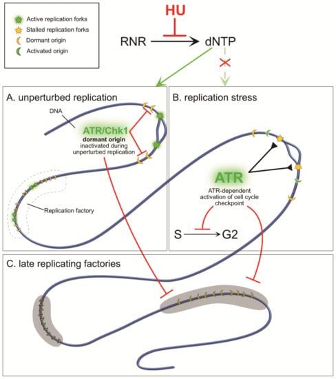 During unperturbed replication (Figure 2A), forks are fired and progress according to the cell internal schedule [,]. Replication is a highly regulated process, involving early- and late-replicating DNA sites (Figure 2C), excess origin licensing [,], grouping of origins within replication factories [], and the proper timing of everything to assure a flawless process of DNA synthesis in the shortest time possible []. From all the licensed origin sites, only a small percentage activate at once and recruit replisome proteins; the other origins remain dormant until they are replicated passively by an active fork or are required to activate when the closest fork stalls or collapses [,,,]. The mechanism by which dormant origins are kept inactive was elusive until recently. New studies show that even during proper replication, cells maintain low levels of ATR and checkpoint kinase 1 (Chk1) proteins (Figure 2A). The ATR/Chk1 signaling pathway usually mediates DNA repair and stabilizes stalled or collapsed replication forks [,,]. However, ATR kinase activity also inhibits initiation of new origins in the absence of DNA damage if there are already active forks within the factory (Figure 2A and Figure 3C). The same pathway also seems to play a role in the inhibition of the initiation of replication factories that are scheduled to replicate later, after the currently active factory finishes DNA synthesis (Figure 2C).