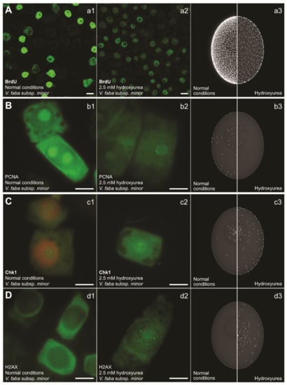 HU changes the activity of replication as well as several key proteins in root meristem cells of Vicia faba. (A) Nuclear DNA labeled with 5-bromo-2′-deoxyuridine (BrdU; a1–a3); (B) PCNA (b1–b3); (C) Chk1 kinase (c1–c3). The DNA within the nucleus is detected with propidium iodide (orange; c1). The control levels of Chk1 are consistent with reports that cells maintain a basic level of kinases in order to prevent dormant origin firing (c1,c3). (D) Histone H2AX (d1–d3), which is a hallmark of double-strand DNA damage (H2AXS139ph), shows increased levels after HU exposure (d2,d3). The presented factors were detected using immunocytochemical staining after 32 h incubation in water (first column, normal conditions; a1,b1,c1,d1) or in 2.5 mM HU (second column; a2,b2,c2,d2). The third column contains 3D renderings of BrdU/protein localization within the nucleus, based on statistical analysis of experimental data and microscope observations (a3,b3,c3,d3). The left side of the column shows the agent’s activity under normal conditions and the right panel shows the activity after HU treatment. The experimental procedures for immunocytochemical detection of: (i) PCNA, (ii) Chk1 (phosphorylated on serine 317), and (iii) H2AX (phosphorylated on serine 139) were identical (BrdU detection required hydrolysis with HCl). The experimental procedure for the DNA replication assay with BrdU (on entire cells) was as follows: control and HU-treated (2.5 mM, 24 h) seedlings were pulsed for 30 min with 30 µM BrdU solution at 20 °C in the dark. Excised 3 mm long meristems were then washed with ice-cold Tris buffer (10 mM Tris, 10 mM EDTA-2Na, 100 mM NaCl, pH 7.2) for 5 min and fixed for 45 min at 4 °C in freshly prepared 4% paraformaldehyde. After fixation, root tips were washed, squashed onto slides, and treated with 1.5 M HCl (for 1.5 h at 20 °C, for partial denaturation of nuclear DNA). In contrast, detection of PCNA/Chk1S317ph/H2AXS139ph required an enzymatic maceration step, i.e., incubation in a citric acid-buffered digestion solution for 45 min at 37 °C. Subsequently, root tips were washed again, squashed onto slides, and treated with the following primary antibodies: (i) mouse monoclonal anti-BrdU (Sigma-Aldrich, Saint Quentin, France) diluted in Tris-buffer (1:50) or (ii) the rabbit monoclonal antibodies anti-PCNA (Abcam, Cambridge, United Kingdom), anti-Chk1(S317ph) (Cell Signaling Technology, Beverly, MA, USA), and anti-H2AX(S139ph) (Cell Signaling Technology; Beverly, MA, USA; 1:250), diluted in PBS. Following overnight incubation (at least 16 h) at 4 °C, slides were washed in Tris/PBS buffer, respectively, and incubated for 1 h with AlexaFluor 488-conjugated goat anti-mouse/mouse anti-rabbit secondary antibodies, respectively (Cell Signaling Technology, Beverly, MA, USA; 1:500), washed, and embedded in PBS/glycerol mixture (9:1) with 3% DABCO.