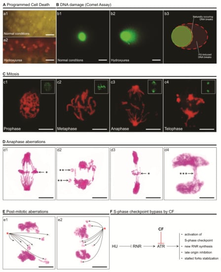 Visual examples of cell death, DNA damage, and chromosome breakage induced by overexposure to HU or bypassing of the S-phase cycle induced by 2.5 mM HU and 5 mM caffeine (CF) in root meristem cells of Vicia faba subsp. minor. (A) Programmed cell death (PCD) visible after double staining with acridine orange (AO) and ethidium bromide (EB) (a1,a2) []. AO is able to enter living cells and makes them appear green (a1). EB is taken up only when cell membrane integrity is compromised (usually in dead or dying cells), making them look red (a2). The range of colors (from green through yellow to red) indicates the existence of living, dying, and dead cells. The scale bar equals 50 µm. (B) DNA damage observed under normal conditions (b1) and after HU treatment (b2). The longer and more visible the comet’s tail is, the more DNA damage is present. DNA was stained with YOYO-1 (green; b1–b3). The scale bar equals 10 µm. (C) Feulgen-stained DNA and chromosome aberrations during mitosis, visible under a red spectrum in a fluorescent microscope (c1–c4) []. The experimental procedure for Feulgen staining (d1–d4,e1,e2) was as follows: root tips were fixed in cold absolute ethanol and glacial acetic acid (3:1, v/v) for 1 h, washed several times with ethanol, rehydrated, hydrolyzed in 4 M HCl (1.5 h), and stained with Schiff’s reagent (pararosaniline; Sigma-Aldrich, Saint Quentin, France) according to standard methods. After rising in SO2–water (three times) and distilled water, 1.5 mm long apical segments of roots were cut off, placed in a drop of 45% acetic acid, and squashed onto microscope slides. Following freezing using dry ice, coverslips were removed, and the dehydrated slides were mounted in Canada balsam. The top right inserts show mitotic morphology under normal conditions; DNA was also Feulgen-stained and the fluorescent image colors were edited to green for better visibility. The scale bars equal 10 µm. (D) Additional examples of anaphase aberrations (Feulgen staining under visible light). The single black asterisks (*) indicate mitotic chromosome fragments that were lost due to a lack of a connection to kinetochores (d1,d3); the double black asterisks (**) indicate O-shaped chromosomes (d2); the three asterisks (***) indicate a chromosome bridge (d4). The scale bars equal 10 µm. (E) Post-mitotic aberrations of decondensing DNA (Feulgen staining under visible light). Chromosome fragments (lost between opposite poles of the cell), i.e., later micronuclei, are indicated with a red asterisk (e1,e2). The scale bars equal 10 µm. (F) Short schematic of an S-phase checkpoint malfunction caused by caffeine (CF), as used in the presented experiments.