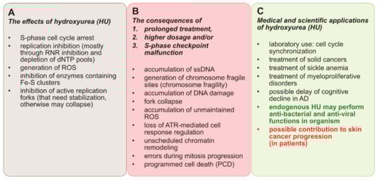 A summary of (A) the effects of HU exposure; (B) the consequences of high dosage, long treatment, and checkpoint deregulation; and (C) the medical and scientific applications of hydroxyurea.
